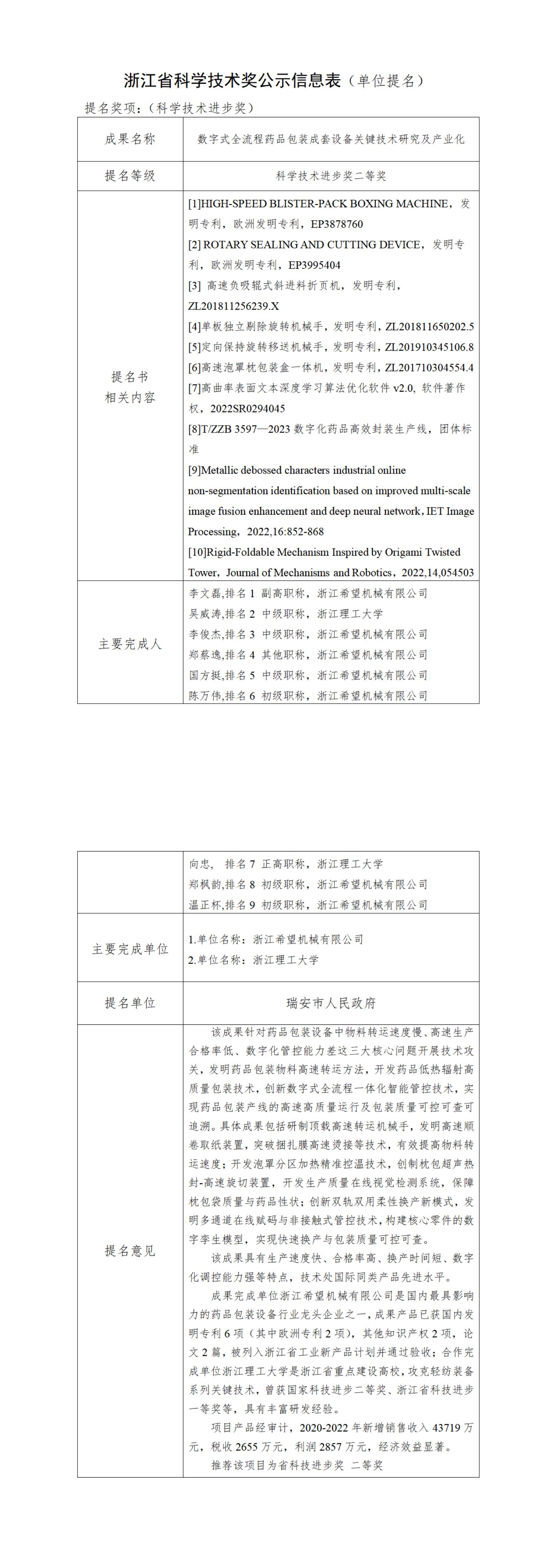 我公司“數(shù)字式全流程藥品包裝成套設(shè)備關(guān)鍵技術(shù)研究及產(chǎn)業(yè)化”項(xiàng)目研制開發(fā)成功后,獲得了較好的經(jīng)濟(jì)效益和社會(huì)效益,符合申報(bào)2023年度浙江省科學(xué)技術(shù)獎(jiǎng)申報(bào)條件,根據(jù)浙江省科學(xué)技術(shù)廳《關(guān)于開展2023年度浙江省科學(xué)技術(shù)獎(jiǎng)提名工作的通知》及《浙江省科學(xué)技術(shù)獎(jiǎng)勵(lì)辦法》等規(guī)定要求,對(duì)本項(xiàng)目相關(guān)內(nèi)容進(jìn)行公示,公示時(shí)間從2024年8月19日開始至2024年8月25日結(jié)束,如對(duì)公示內(nèi)容有異議,可在公示期內(nèi)向公司總經(jīng)辦反映。