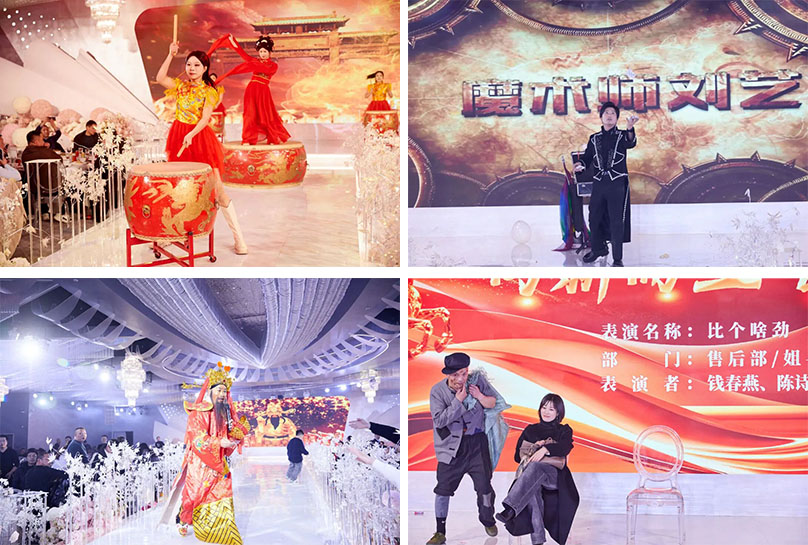 晚會(huì)節(jié)目精彩紛呈,均由公司員工自編自演,展現(xiàn)了團(tuán)隊(duì)的創(chuàng)造力與凝聚力。生產(chǎn)部《三句半》、技術(shù)與銷(xiāo)售部聯(lián)袂演出的搞笑舞蹈《青蛙舞》、生產(chǎn)倉(cāng)庫(kù)《馬年Style》等節(jié)目輪番登場(chǎng)。由售后部帶來(lái)的創(chuàng)意走秀《樣品奇遇記》,將公司產(chǎn)品從車(chē)間搬上舞臺(tái),結(jié)合產(chǎn)品功能與藝術(shù)表達(dá),呈現(xiàn)了一場(chǎng)別開(kāi)生面的視覺(jué)盛宴,贏得現(xiàn)場(chǎng)陣陣掌聲。
